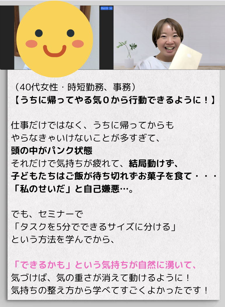 今まで全部大事だと思っていたけれど、書き出して整理すると「やらなくてもいいこと」があると気づき、無駄な時間を減らせました。